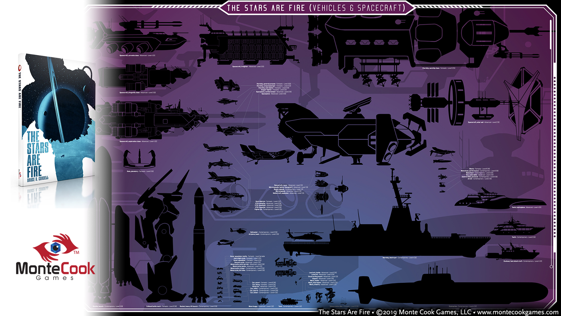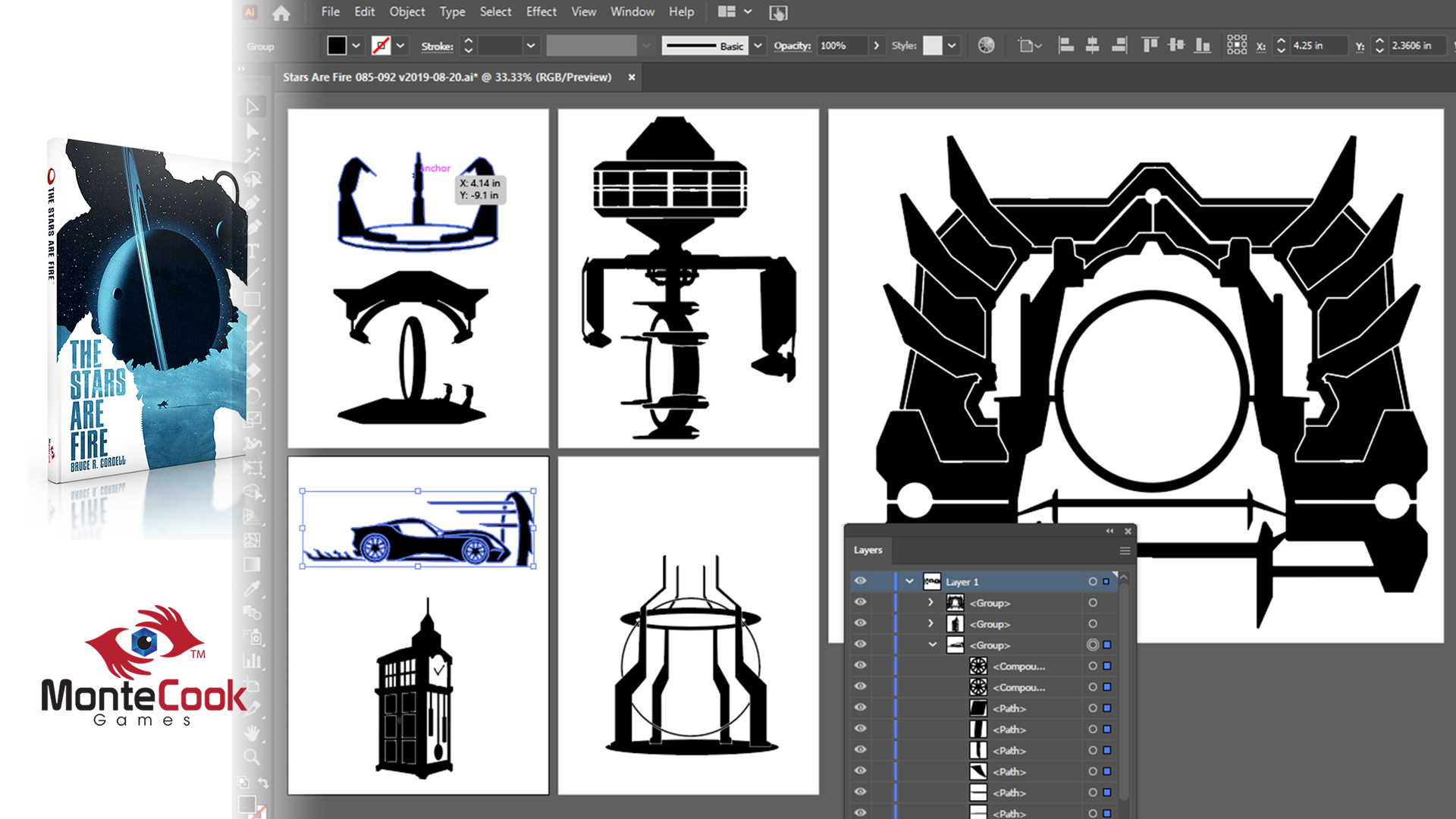 MonteCook Games commissioned 100 original vector illustrations for their science fiction setting game The Stars Are Fire. We created black and white silhouettes based on existing and non-existing technologies. Art Director Bear Weiter.